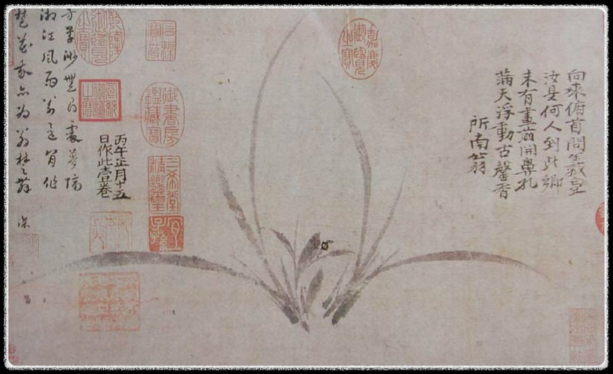 작가 : 정사소(鄭思消)제목 : 화란(畵蘭 : 1306)언제 : 元재료 : 두루마리 종이에 수묵규격 : 25.7 x 42.4 cm소장 : 오오사카 시립미술관 해설 : 정사소는 자가 소남(所南). 호가 삼외야인(三外野人)이고, 남송 말, 원초의 사대부 화가로서 유민(遺民) 화가 중 가장 대표적인 사람이다. 이 그림에는 아무런 배경도 없이 두 포기의 난초만이 화면 한 가운데에 포치되어 있고. 그 오른쪽에는 난초의 향기를 찬미하는 화가 자필의 시 한 수가 씌어 있다. 엷은 먹으로 그린 힘 있게 뻗은 난초잎과. 재야(在野)에서 덕을 과시하는 선비의 인품과 비유되는 은은한 난초의 향기를 찬미하는 시는 유민 화가의 지조를 표현하기에 충분하다. 난초 뿌리가 묻힐 흙도 없이 그린 것은 몽고족에게 국토를 빼앗긴 상태를..